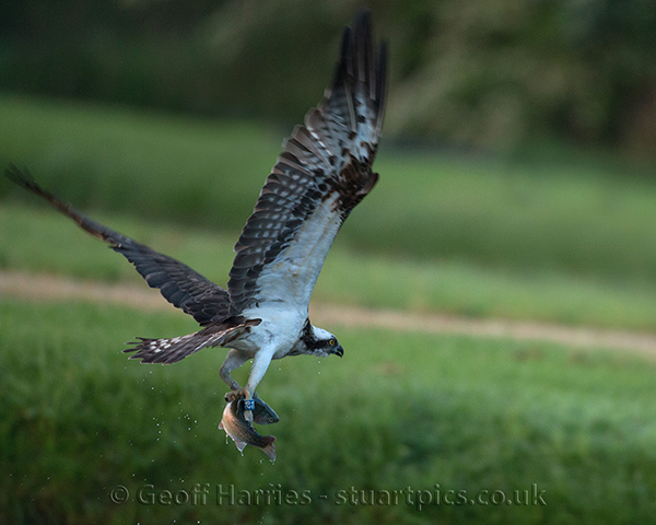 It was 04.10 and a cloudy dark morning, osprey 28(10) was already waiting in a tree to dive and catch a fish at the Ryhall trout farm. Disturbed by our arrival it flew off, but we knew it would return shortly and was back by 04.40 and perched up ready to fish. After a run in with a crow it circled over the pool and finally splashed down at 04.59:36 and flew off with a large trout at 04.59:41. The images posted are the 5 second fishing sequence.