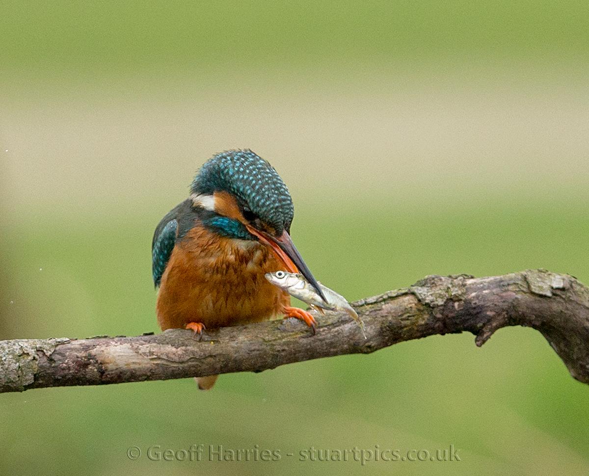 This beautiful female kingfisher demonstrated her skills at catching fish. In the second picture she had an intruder, another female on her perch, but she chased it off out of her area. This bird was unusual, as females are more nervous than males, but she was quite happy to perch up close and stay there for long periods.
