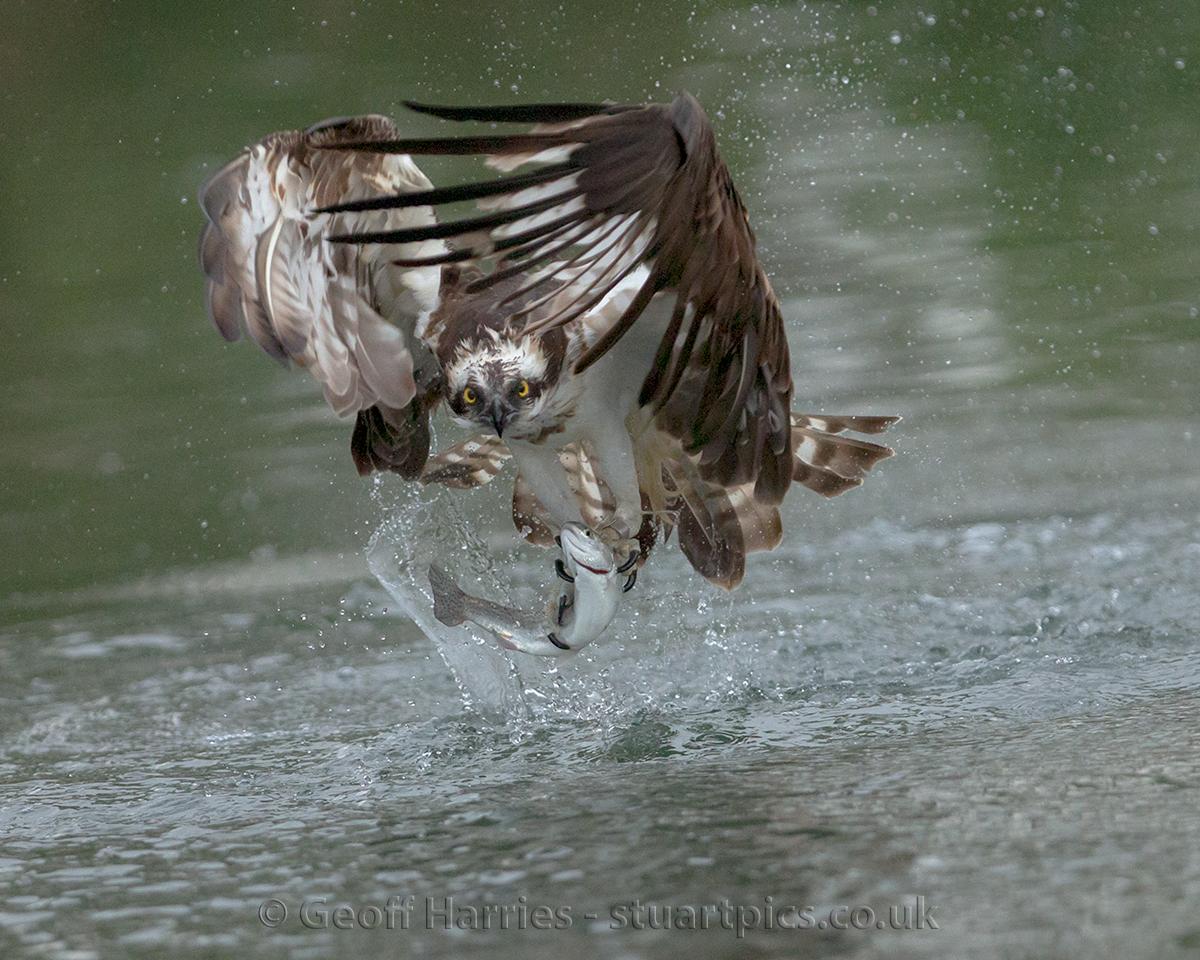 A selection of osprey images of three different birds taken at Horn Mill trout farm. My enjoyment comes from seeing the ospreys diving, the bonus is recording the action in these images. Every dive is different, some birds perch and dive while others plunge straight out of the sky. The birds fish what ever the weather, getting sharp action images is easier in good light. Every session presents different challenges and that is what keeps me returning for more