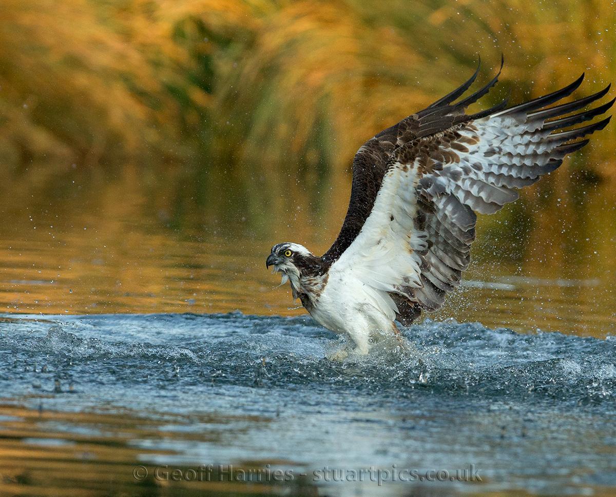 Light is an essential requirement for photography with the soft glowing light that occurs just before sunset described as the golden hour. Usually when there is good light the subject has disappeared, but on Sunday evening I was lucky to have osprey 28(10) dive for a fish during this period of beautiful golden light.